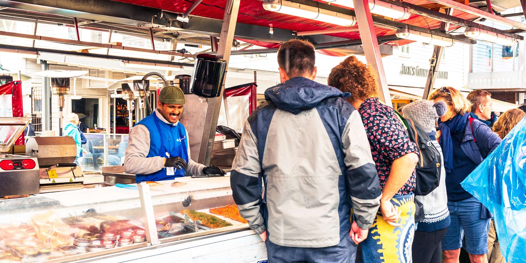 I Mathallen er det varierende åpningstider for de ulike fiskehandlerne.
